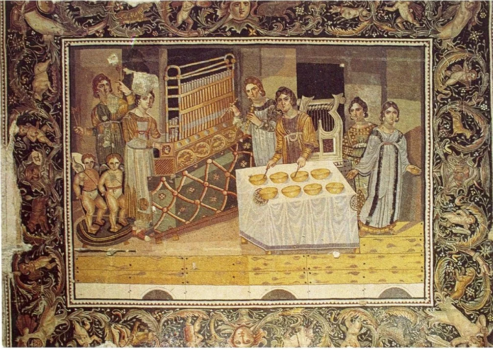 Musicians with horns and a water organ, detail from the Zliten mosaic, 2nd century CE